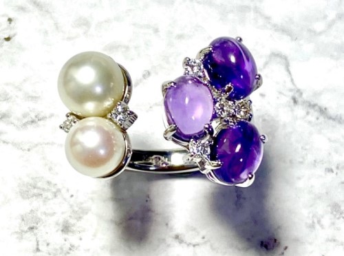 2022.10.20 お客様商品 【ビフォーアフター】手持ちのルースをお持ちになり、ご自身の手書きの絵からの製作<お客様の声>モアさんのホームページを見て、ダイヤとパールのリングを見ていいなーと思っておりました。前にモアさんでリフォームした時の残りのアメジストとパールを利用して、と思いイメージの絵を書いて相談したらお見事!すっごく気に入りました。想像以上でびっくり。本当にやってよかったです。
