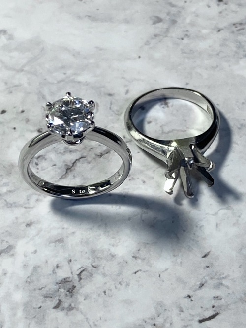 2022.03.09 お客様商品 <お客様の声>昔の立爪はさすがに今できないですね。でも同じ6本爪で立爪タイプでも、このように低く、爪が小さく丸くきれいにそろっているとダイヤモンドがはっきり目立っていいなと思ったので、他にもいろいろなデザインがありましたけど、これにしました。シンプルで気に入ってます。リフォームして良かったです。
