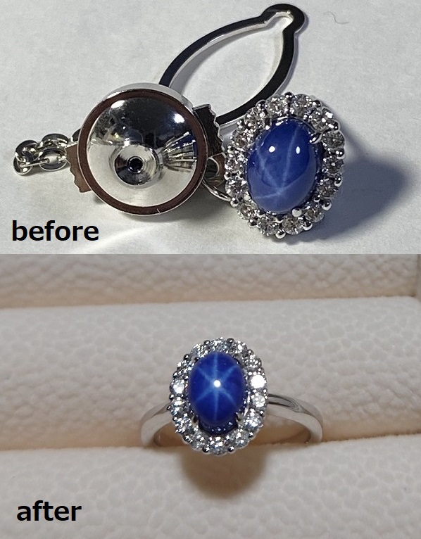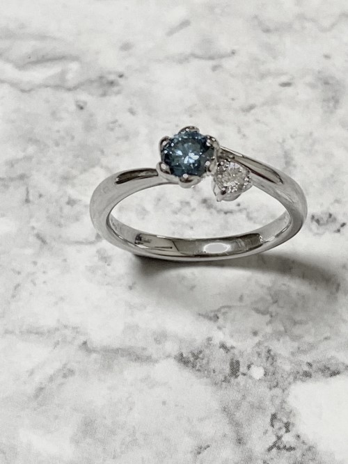 2021.10.22 お客様商品 【ビフォーアフター】<お客様の声>昔の母の立爪のダイヤを利用して、前から欲しかったブルーダイヤをモアで購入して、念願のデザインを手造りしました。ブルーダイヤと無色透明ダイヤとのコントラストがとても気に入ってます。大満足!毎日します!