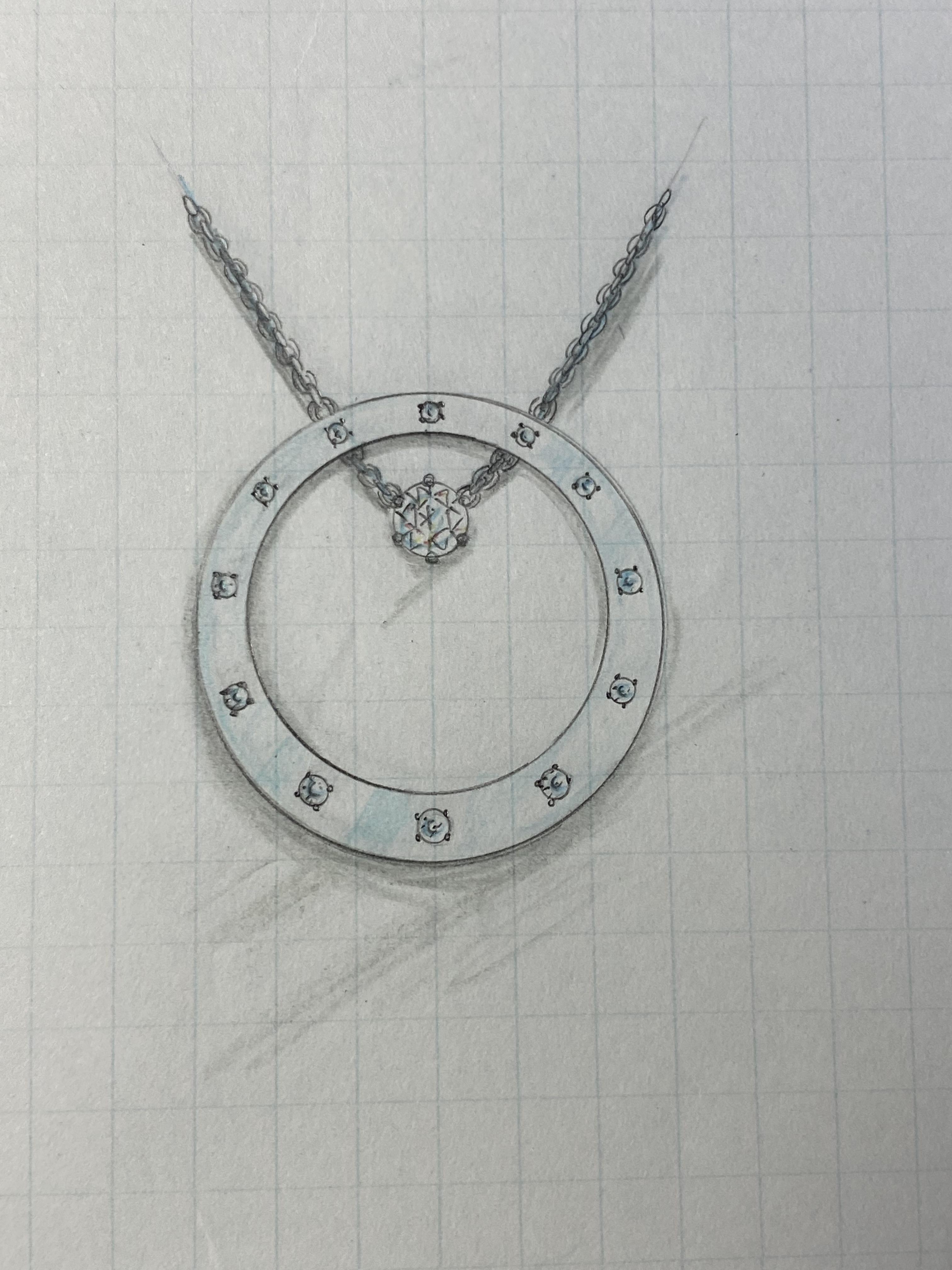 2022.08.04 お客様商品 <お客様の声> もう使わなくなった立爪のダイヤ0.426Ctを活かして洋服の上からザックリさげるペンダントが欲しかったので、自分でこんな感じの物がいいと相談したら、 私の手書きの絵をデザイナーさんが書き直してくれました。デザイン画を見て納得。プラチナでの製作途中で一度確認のため見せてもらい、OKでした。 そして数日後出来上がりを見て、大感!、私の思いつきで書いたあの絵からこんなにかっこよくできたなんて、想像以上でした。やってよかったです。