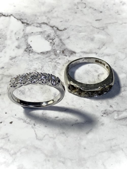 2022.06.22 お客様商品 <お客様の声>前になくなった母のことが大好きだった父が亡くなりました。二人の遺灰をリングに内包したいことを、モアさんに相談したところ、以前ペンダントヘッドに内包したものを造ったことがある、とのことでした。常にしていたいのでシンプルで少し変化のある枠をサンプルの中から選びました。この指輪は特別なもの、いつも肌身離さず、母、父といつも一緒な気持ちです。