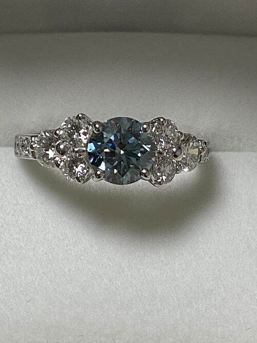2020.10.01 ダイヤモンドセールでお買い上げ頂いたダイヤを使って! 特別のご注文で1ctのブルーダイヤを中石にして、脇に0.1ctを4pcs0.2ctを2pcsウデに0.02ctを6pcsプラチナで手造りリングでした。百貨店通常価格の少なくても40万円引きの価格でお納め致しました。モアはメーカーなので問屋に納品する価格でご提供できます。。もう一本お気に入りの指輪があるので、それと重ね付けをしたいとのことで、このデザインにしました。大変喜んで頂きました。